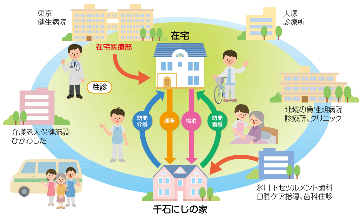 千石にじの家では、通いサービスを中心に必要に応じて訪問介護・看護、泊まりサービスを組み合わせて提供します。